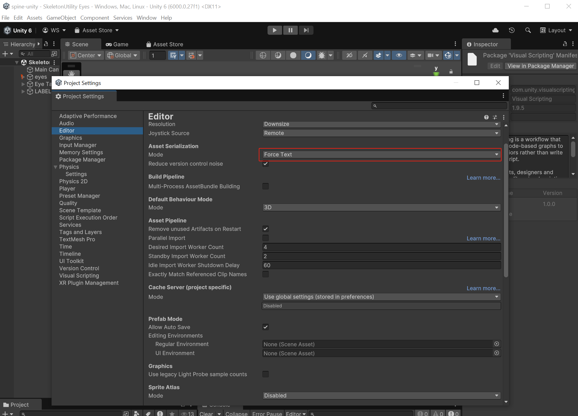 然后在 Editor 页中将资产序列化(Asset Serialization)的 Mode 选项置为 Force Text, 以确保资产使用文本方式序列化资产。